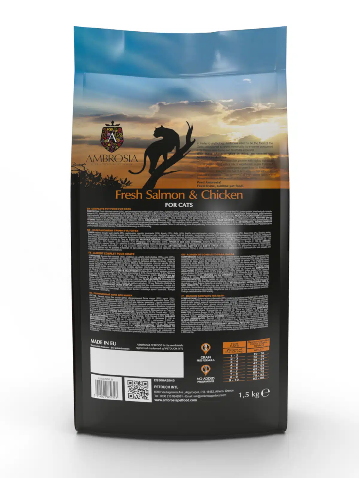 Mūsų „Ambrosia“ šviežios lašišos ir vištienos recepte derinami lengvai virškinami žuvų baltymai iš šviežios lašišos filė kartu su baltyminga dehidratuota vištiena ir atrinktais vaisiais bei daržovėmis. Šis šviežios lašišos ir vištienos receptas sukurtas sterilizuotoms katėms, jame yra mažai magnio ir DL-metionino, kuris padeda išvengti struvitinių akmenų susidarymo ir apsaugoti šlapimo sistemą. Jame taip pat yra prebiotikų ir probiotikų, kurie gerina virškinimą ir imuninę sistemą, chondroitino ir gliukozamino, kurie apsaugo sąnarius, o taurino ir L-karnitino, kurie skatina smegenų vystymąsi ir širdies bei raumenų sistemą.